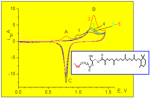Details: Bente-Jeanette Foss, Ana Ion, Vassilia Partali, H.-R.Sliwka, and F. G. Banica, ”Electrochemical and EQCM investigation of a selenium derivatized carotenoid in the self-assembled state at a gold electrode”, J. Electroanal. Chem., 593 (2006) 15-28. Full paper ; Bente Jeanette Foss, Ana Ion, Vassilia Partali, H -R Sliwka and F. G. Banica, "1-(7-Selenaoctanoyl)-glycerol as an Anchor for Self-Assembly of Biological Compounds at the Gold Surface", Collect. Czech. Chem. Commun.,69 ( 2004) 1971-1996. Abstract